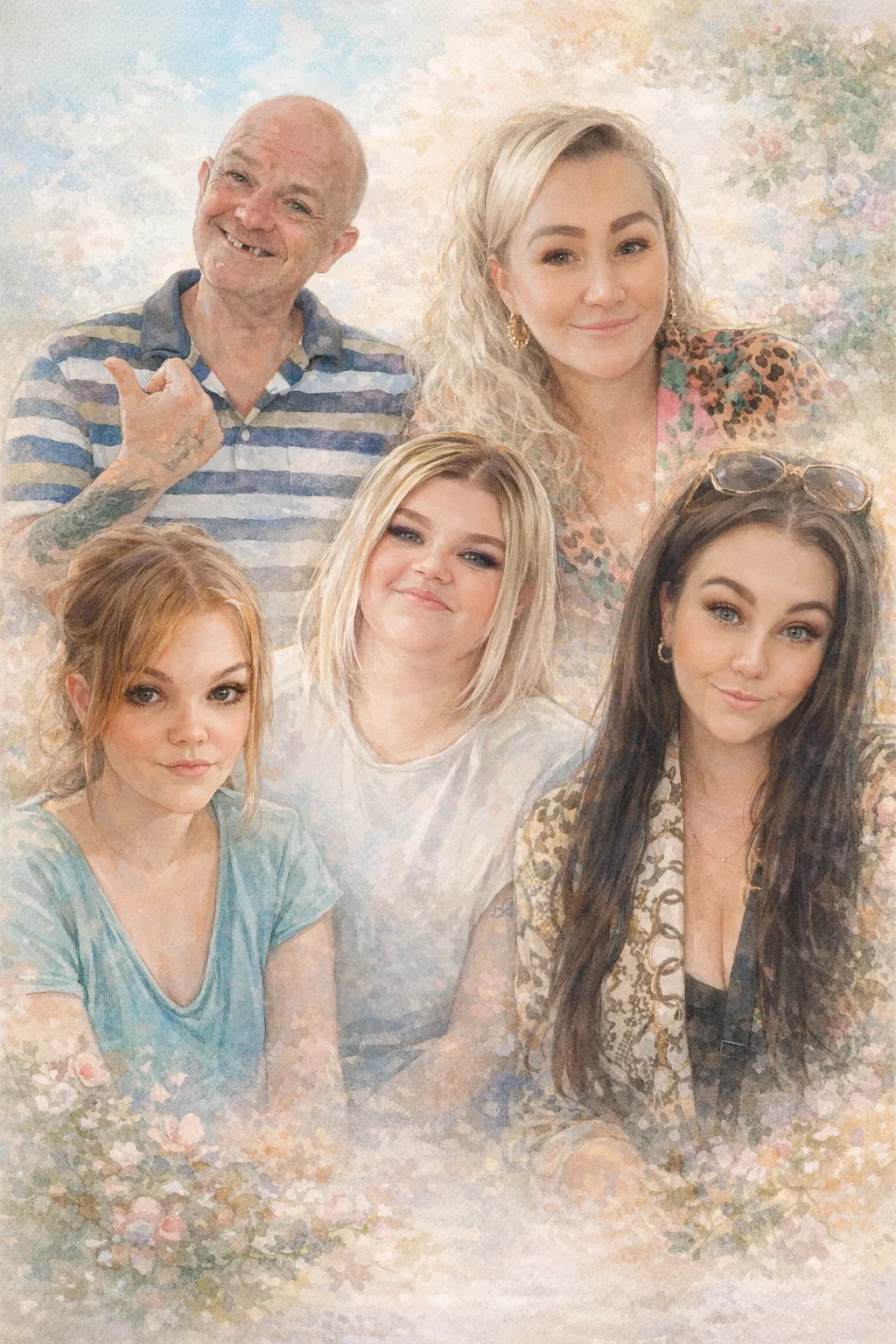 A soft, artistic style that gently blends your chosen photograph into flowing watercolour textures. Subtle brush strokes and muted tones create a peaceful, timeless tribute while preserving the likeness and expression of your loved one.
