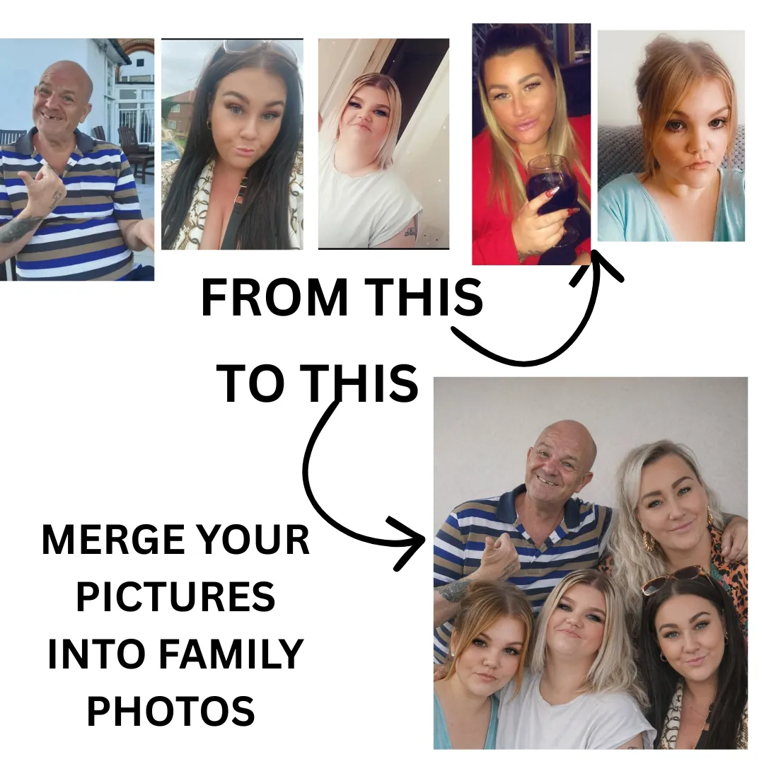Multiple photographs can be seamlessly combined into a single, natural-looking image. Whether it’s bringing loved ones together, recreating a special moment, or completing a family portrait, each merge is crafted with precision and realism.